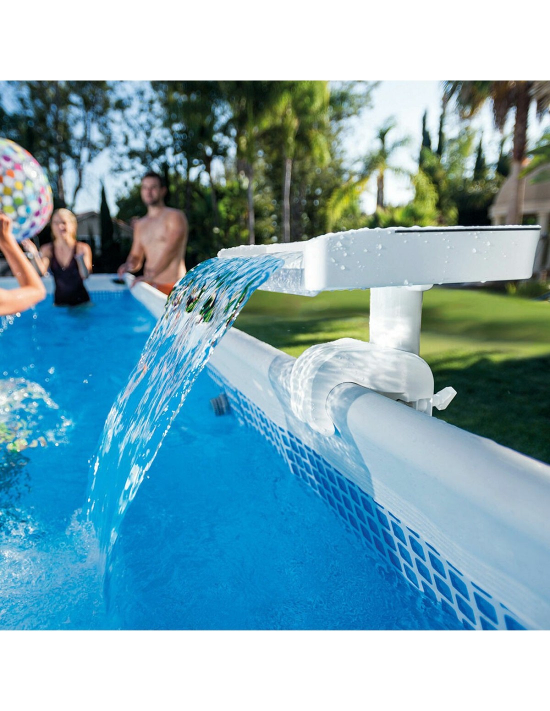 Die Led pool cascada von Intex ist ein für Schwimmbecken entwickeltes Zubehör, das dank seiner integrierten mehrfarbigen LED-Leuchten einen dekorativen und funktionalen Akzent setzt und nachts für eine attraktive Atmosphäre sorgt. Hergestellt aus weißem PVC und Kunststoff, ist dieser Wasserfall einfach zu installieren und kompatibel mit Standard-Intex-Pools. Mit den Maßen 38 x 33,5 x 31,5 cm eignet er sich gut zur Ergänzung von Poolbereichen, ohne viel Platz einzunehmen. Die robuste Konstruktion ist ideal für den Außeneinsatz, und das LED-Beleuchtungssystem bietet niedrigen Energieverbrauch sowie Langlebigkeit, was das Erlebnis im Wasserbereich verbessert. Obwohl die Nutzung für Personen ab 6 Jahren empfohlen wird, ist das Design vor allem auf die Verschönerung von Familien- und Freizeitpools ausgelegt. Dieses Modell überzeugt als praktisches und ästhetisches Produkt, das Wasserzirkulation und Beleuchtung kombiniert, um die Atmosphäre und den Genuss im Wasserbereich zu steigern. Insgesamt stellt die Led pool cascada von Intex eine zuverlässige und attraktive Option dar für alle, die moderne Dekorelemente mit LED-Technologie in ihrem Pool integrieren möchten.