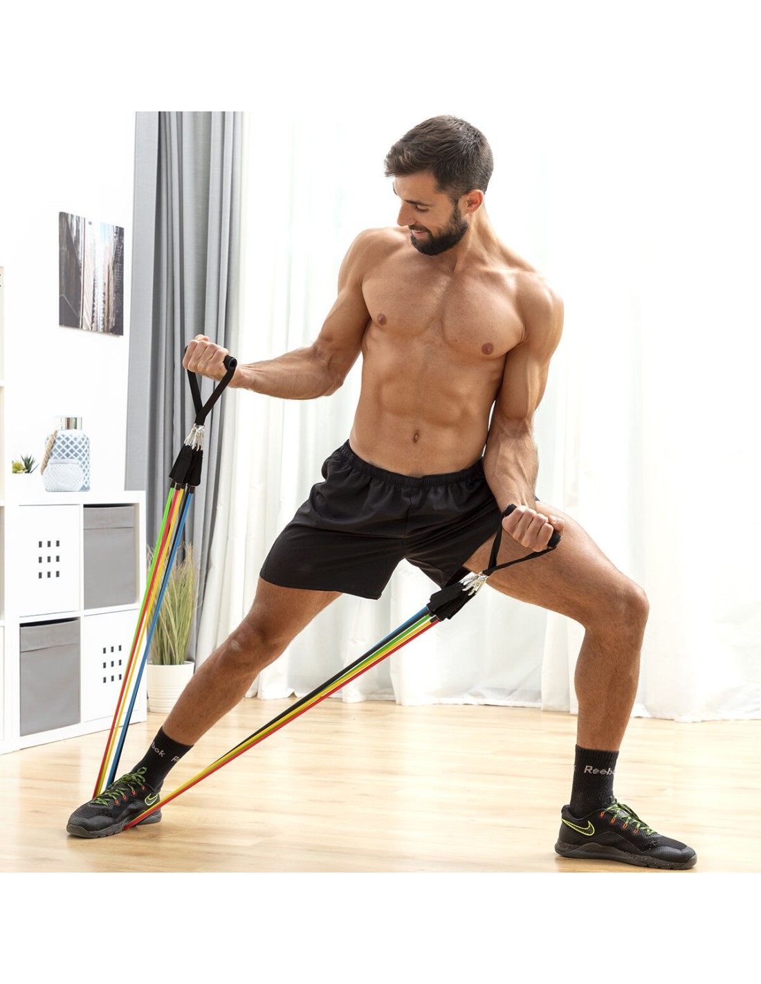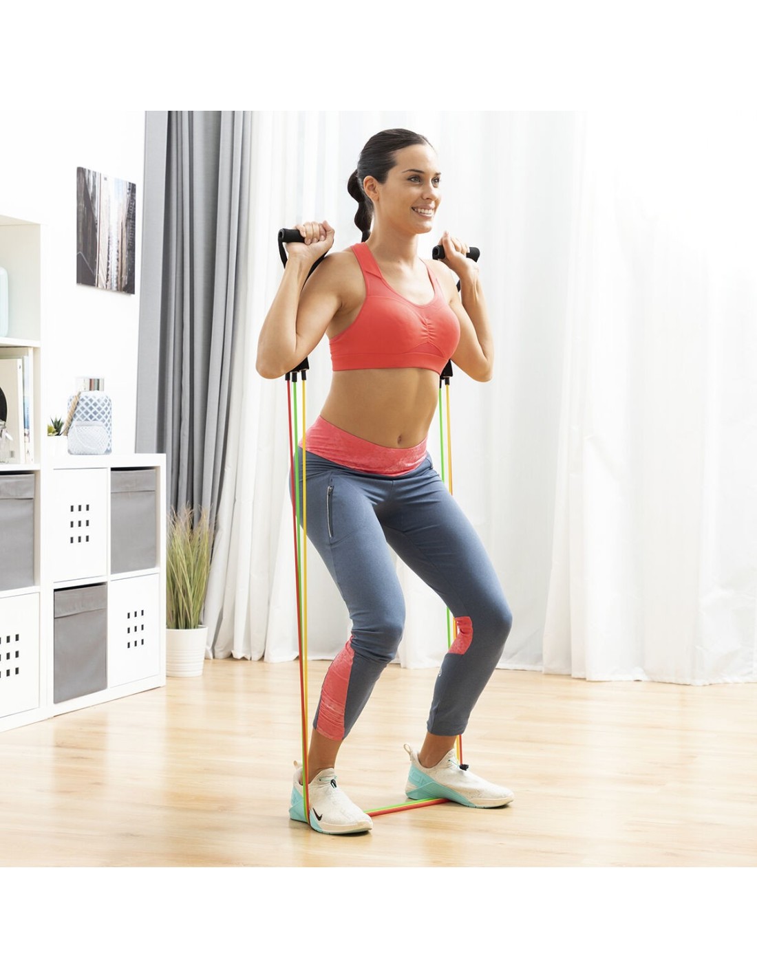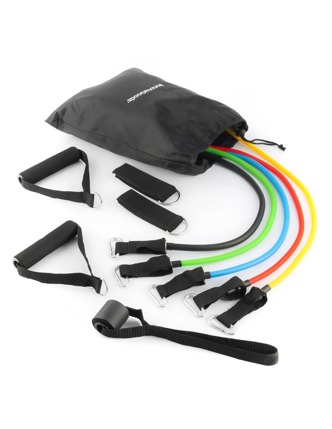 Ein Satz von 5 regulierbaren Stretchbändern in verschiedenen Farben (je nach Intensitätsstufe) einschließlich Übungsanleitung, Tragetasche und Zubehör zur Durchführung einer Vielzahl von Übungen für Arme, Schultern, Brust, Gesäß, Beine usw. Die Stretchbänder können zusammen oder einzeln verwendet werden. Außerdem verfügen sie über Schaumstoffgriffe und Metallkarabiner, um eine optimale Stützfunktion zu gewährleisten. Dank des tragbaren Designs und der Tragetasche kann das Set überall leicht eingesetzt werden.