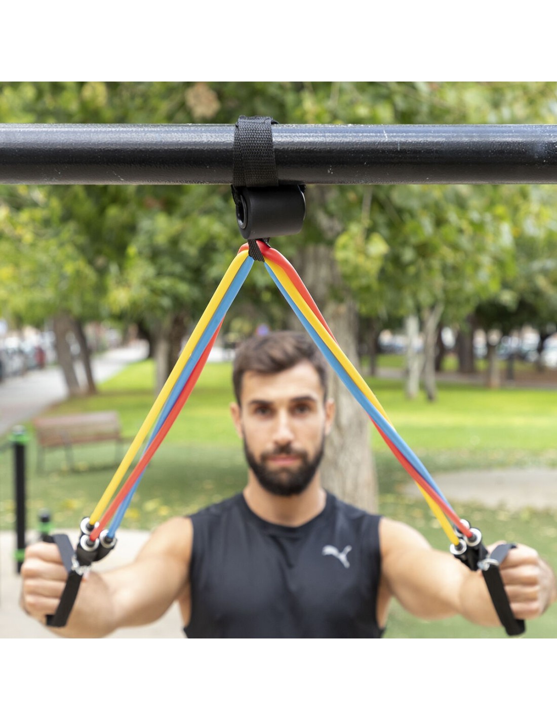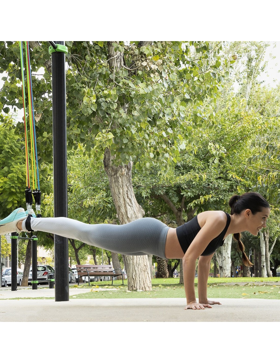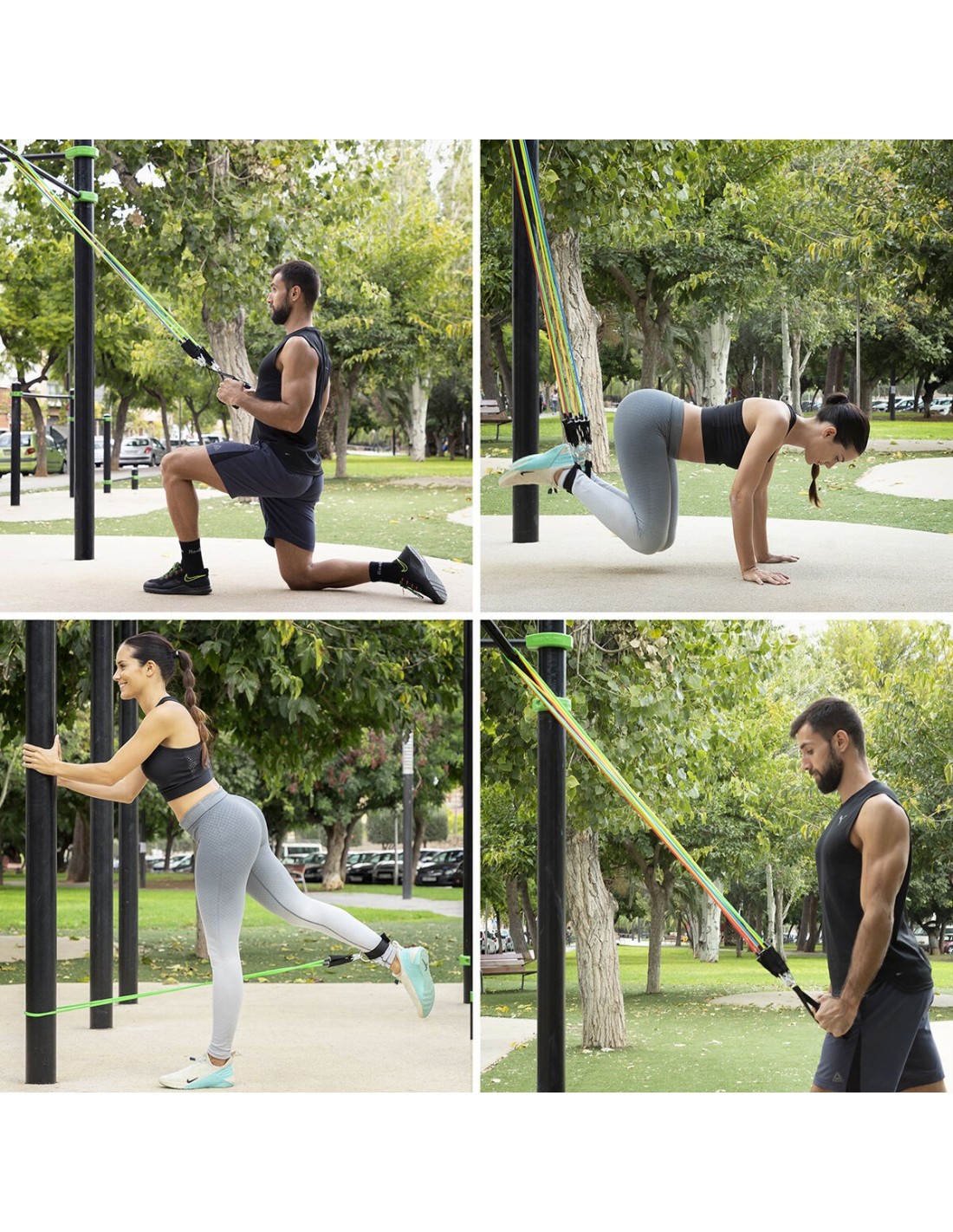 Ein Satz von 5 regulierbaren Stretchbändern in verschiedenen Farben (je nach Intensitätsstufe) einschließlich Übungsanleitung, Tragetasche und Zubehör zur Durchführung einer Vielzahl von Übungen für Arme, Schultern, Brust, Gesäß, Beine usw. Die Stretchbänder können zusammen oder einzeln verwendet werden. Außerdem verfügen sie über Schaumstoffgriffe und Metallkarabiner, um eine optimale Stützfunktion zu gewährleisten. Dank des tragbaren Designs und der Tragetasche kann das Set überall leicht eingesetzt werden.