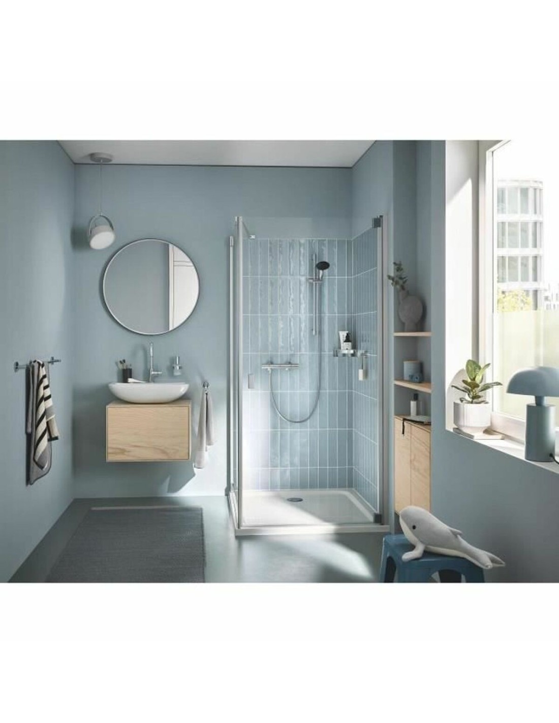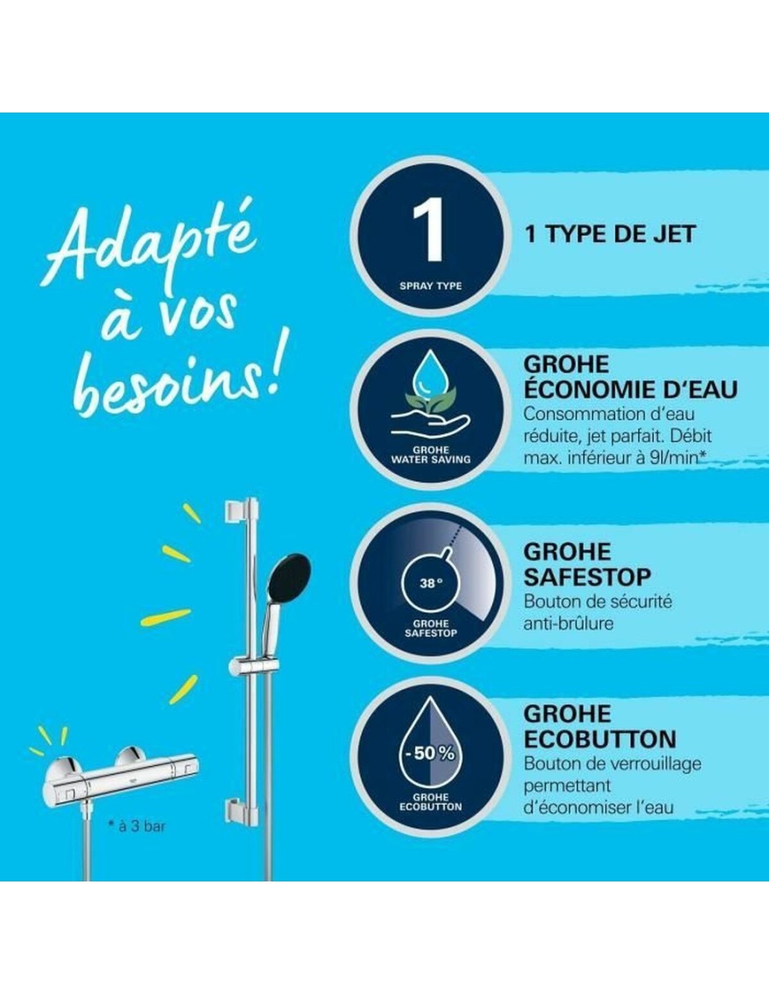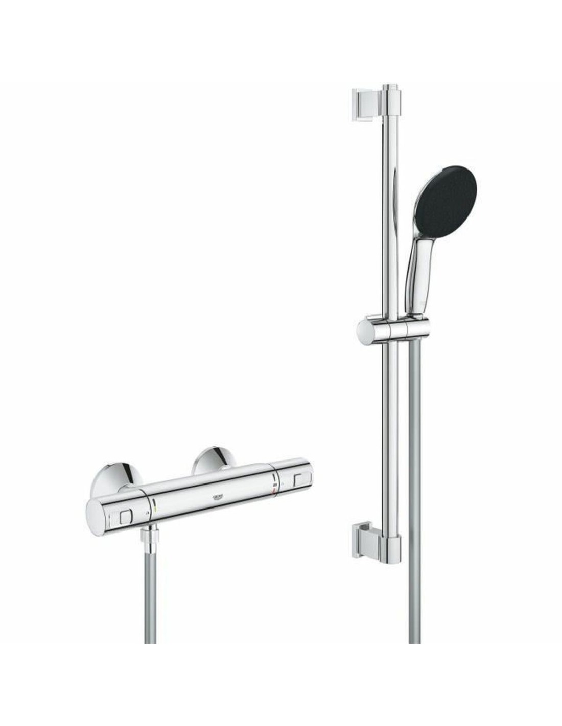 Le Precision Start de Grohe est une colonne de douche murale alliant fonctionnalité et durabilité, idéale pour rénover ou installer des systèmes de douche modernes. Principalement fabriquée en métal chromé, elle présente une finition polie garantissant résistance à la corrosion et un aspect élégant qui s’intègre à toute salle de bains contemporaine. Elle inclut un mitigeur thermostatique permettant de maintenir une température d’eau constante, évitant les variations et assurant confort et sécurité pendant la douche. Son pommeau offre un jet unique assurant une répartition uniforme de l’eau pour une expérience de douche agréable et efficace. Le système comprend une barre de 60 cm facilitant l’installation et le réglage du pommeau à la hauteur souhaitée, ainsi qu’un flexible pour plus de mobilité et de confort. Ce modèle est également conçu pour favoriser l’économie d’eau, optimisant la consommation sans compromettre la performance, contribuant ainsi à une meilleure durabilité à domicile. L’association de matériaux de haute qualité, incluant des éléments plastiques et métalliques chromés, garantit robustesse et fonctionnalité sur le long terme. En résumé, le Grohe Precision Start représente une solution pratique et performante, adaptée à ceux qui recherchent un équipement de douche précis, facile à installer et au design harmonieux pour salles de bains modernes.