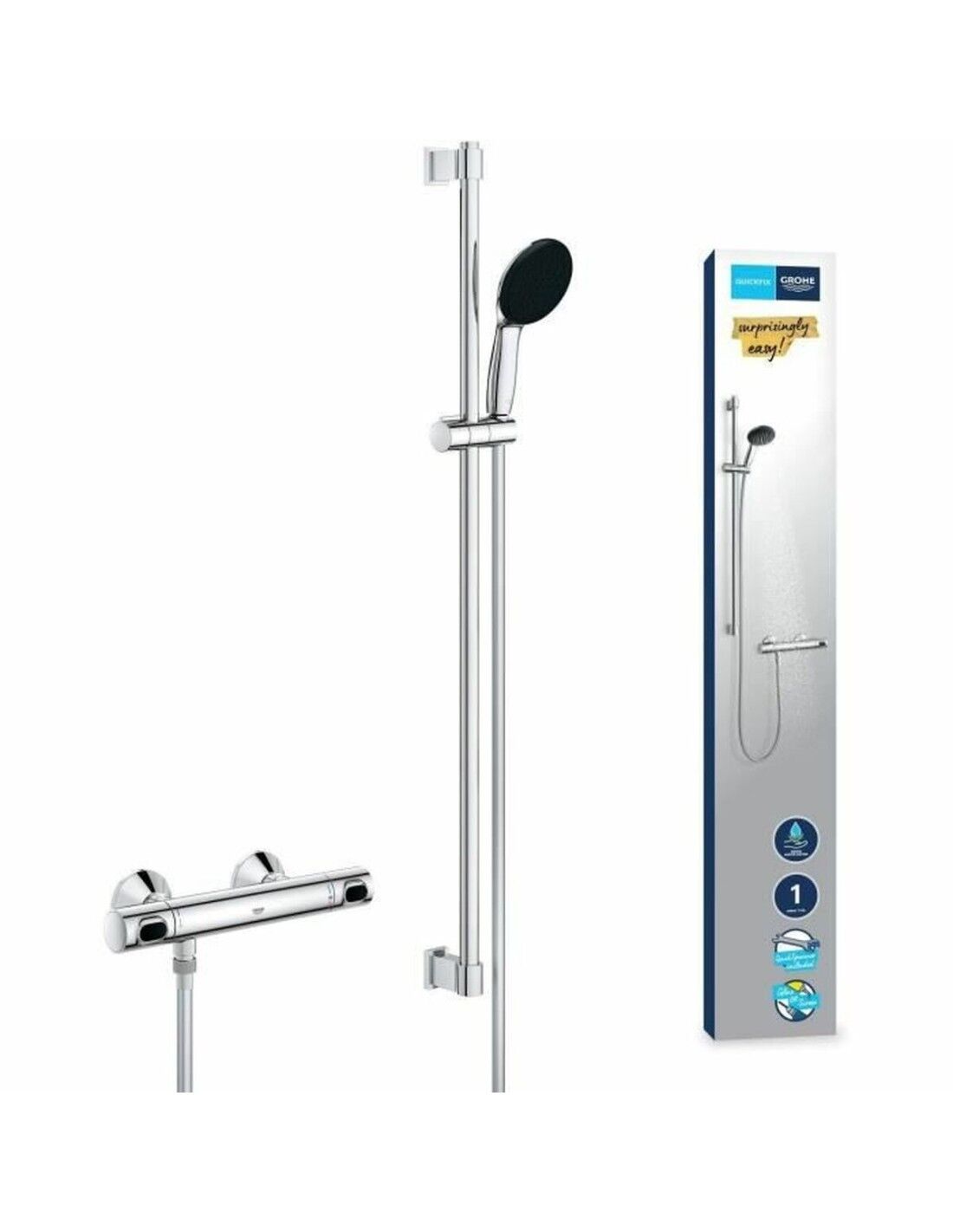 Il set doccia termostatico del marchio Grohe offre una soluzione completa e funzionale per il bagno, caratterizzata da un design moderno ed efficiente. Questo sistema include una colonna doccia con un miscelatore termostatico che mantiene una temperatura costante e sicura per tutta la durata della doccia, evitando bruschi cambiamenti di caldo o freddo. Presenta una finitura cromata accuratamente lucidata, che garantisce resistenza alla corrosione e un aspetto elegante e brillante, facilitandone anche la pulizia e la manutenzione. Realizzato in plastica di alta qualità combinata con componenti metallici, il set è progettato per un montaggio semplice a parete, ottimizzando lo spazio del bagno senza rinunciare al comfort. Il meccanismo termostatico assicura non solo sicurezza ma anche risparmio energetico regolando la temperatura con precisione. La funzionalità del prodotto è completata da un getto unico d’acqua che offre un flusso uniforme e piacevole, ideale per chi cerca un’esperienza di doccia pratica ed efficiente. La tonalità grigia conferisce uno stile neutro e sobrio, adatto a diversi stili di arredamento. Questo set è una scelta adatta a chi apprezza qualità, durata e prestazioni tecniche negli accessori per il bagno, mantenendo un equilibrio tra design contemporaneo e funzionalità. Con questo modello, Grohe conferma il suo impegno per l’innovazione e l’affidabilità nelle soluzioni per la doccia.