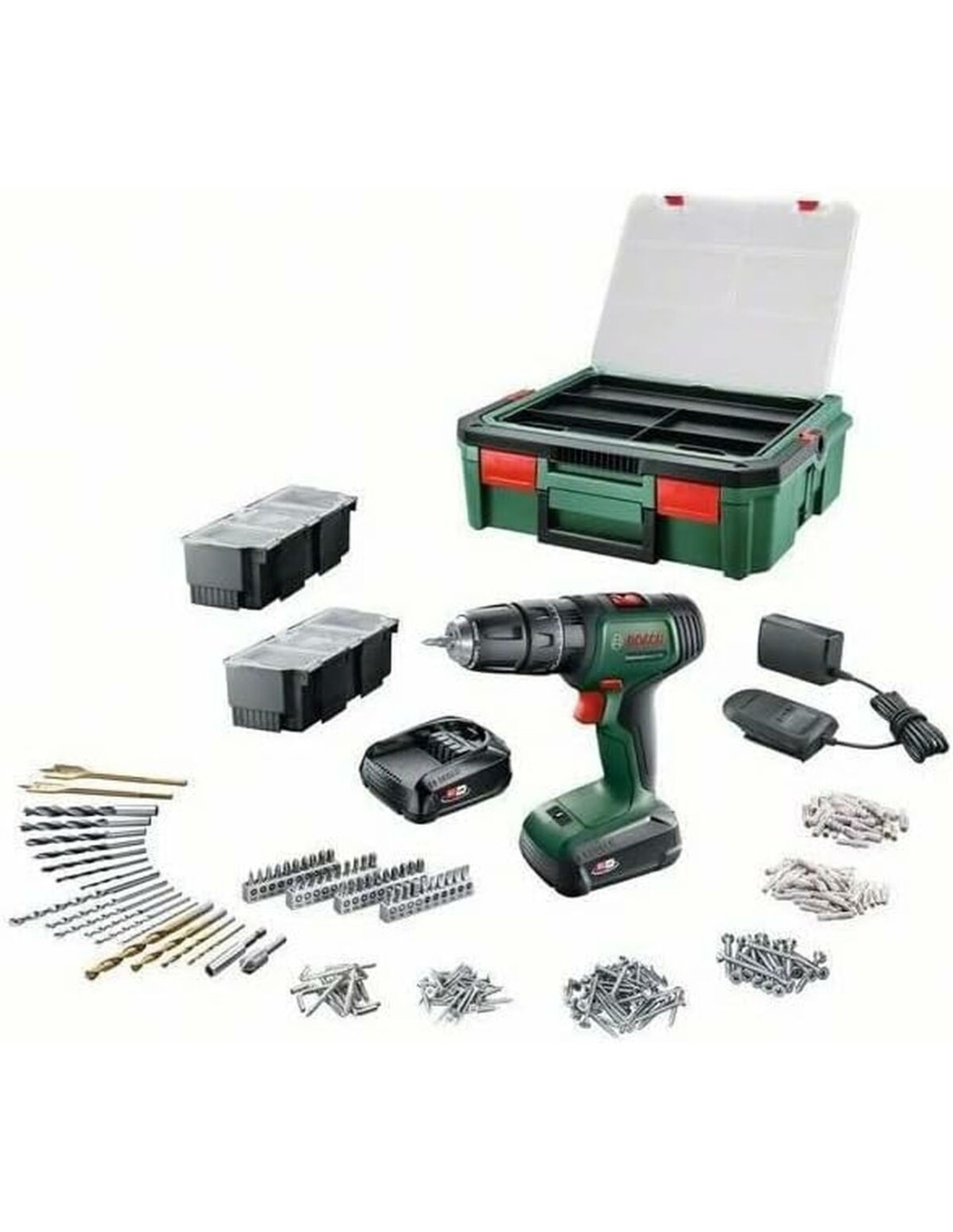 De Bosch UniversalDrill 18 elektrische schroefboormachine is een veelzijdig en compact draadloos gereedschap, ontworpen voor gebruikers die kracht en efficiëntie nodig hebben bij doe-het-zelf- en professionele klussen. Uitgerust met een motor die tot 1.450 rpm bereikt, maakt dit model nauwkeurig en snel boren en schroeven in materialen zoals hout, metaal en kunststof mogelijk. Het werkt op een 18 V lithium-ion accu met een capaciteit van 1,5 Ah, wat voldoende autonomie biedt voor langdurig gebruik en het voordeel heeft dat deze accu verwisselbaar is met andere Bosch draadloze gereedschappen van hetzelfde voltage. Het ergonomische ontwerp en de kenmerkende Bosch groene kleur staan voor de kwaliteit en duurzaamheid van deze internationaal erkende fabrikant. Daarnaast wordt het product geleverd in een complete SystemBox opbergkoffer, inclusief twee 18 V 1,5 Ah oplaadbare accu’s, een AL 1810 CV lader en een doos met 241 accessoires, wat een zeer complete set biedt om diverse klussen uit te voeren zonder extra accessoires. De combinatie van kracht, draagbaarheid van de accu en de grote verscheidenheid aan accessoires maakt het geschikt voor zowel huishoudelijk als licht industrieel gebruik, waardoor het een betrouwbaar apparaat is om comfortabel en gecontroleerd te boren en schroeven. De integratie van deze schroefboormachine in het Bosch gereedschapsecosysteem vergroot de veelzijdigheid en toegevoegde waarde. Al met al is de Bosch UniversalDrill 18 een evenwichtige oplossing die prestaties en functionaliteit biedt voor wie compacte en multifunctionele elektrisch gereedschap zoekt.